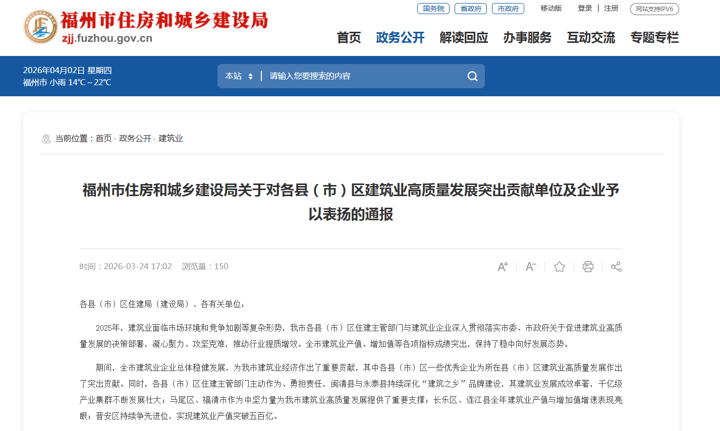 “对永泰县建筑业高质量发展作出突出贡献”的称号